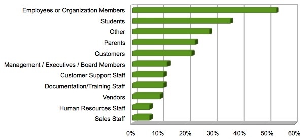 This question is subtly different from the previous in that it tracks not the customer's company or organization type, but rather the actual users of the sites. These results can help us hone the user experience to best serve the context in which our users are coming to EditMe.
